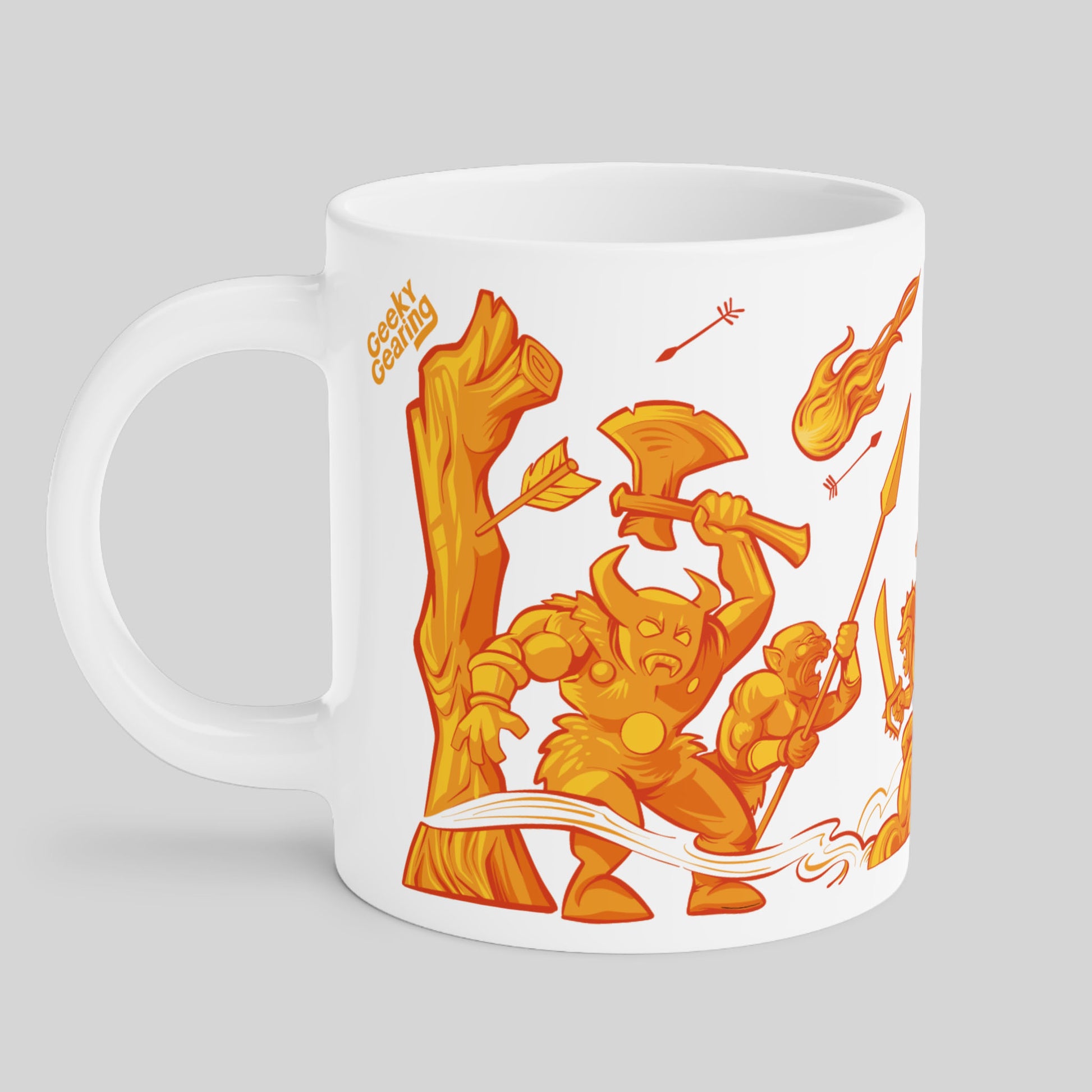 The Orc Fuel Mug features a serene orc warrior calmly sipping coffee amid battlefield chaos. He's your morning ally, reminding you that even the fiercest fighters need a moment of peace before charging into the fray.