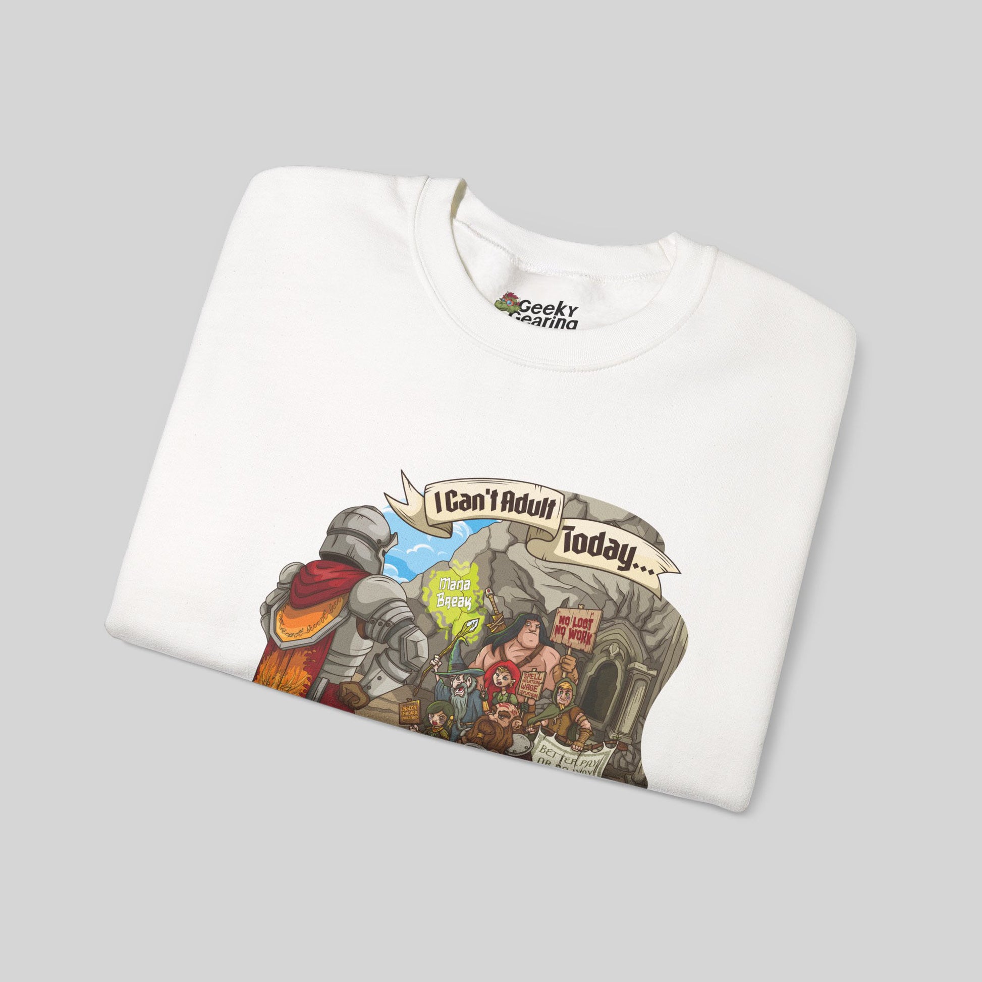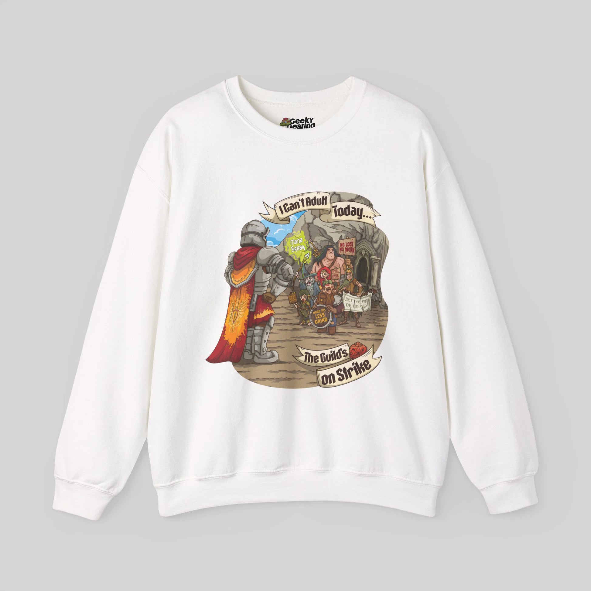 More XP, less grind. The Guild Strike sweatshirt features disgruntled adventurers refusing to save the world until the loot distribution improves.